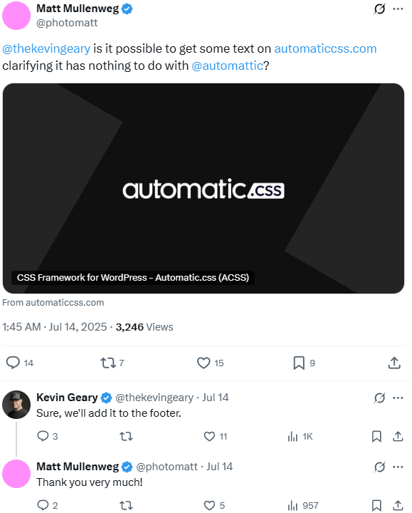The letter caught some in the WordPress industry by surprise, since Geary had months ago shown good-faith compliance after Mullenweg tweeted a request for Geary to place a disclaimer in the footer of Automatic.css.