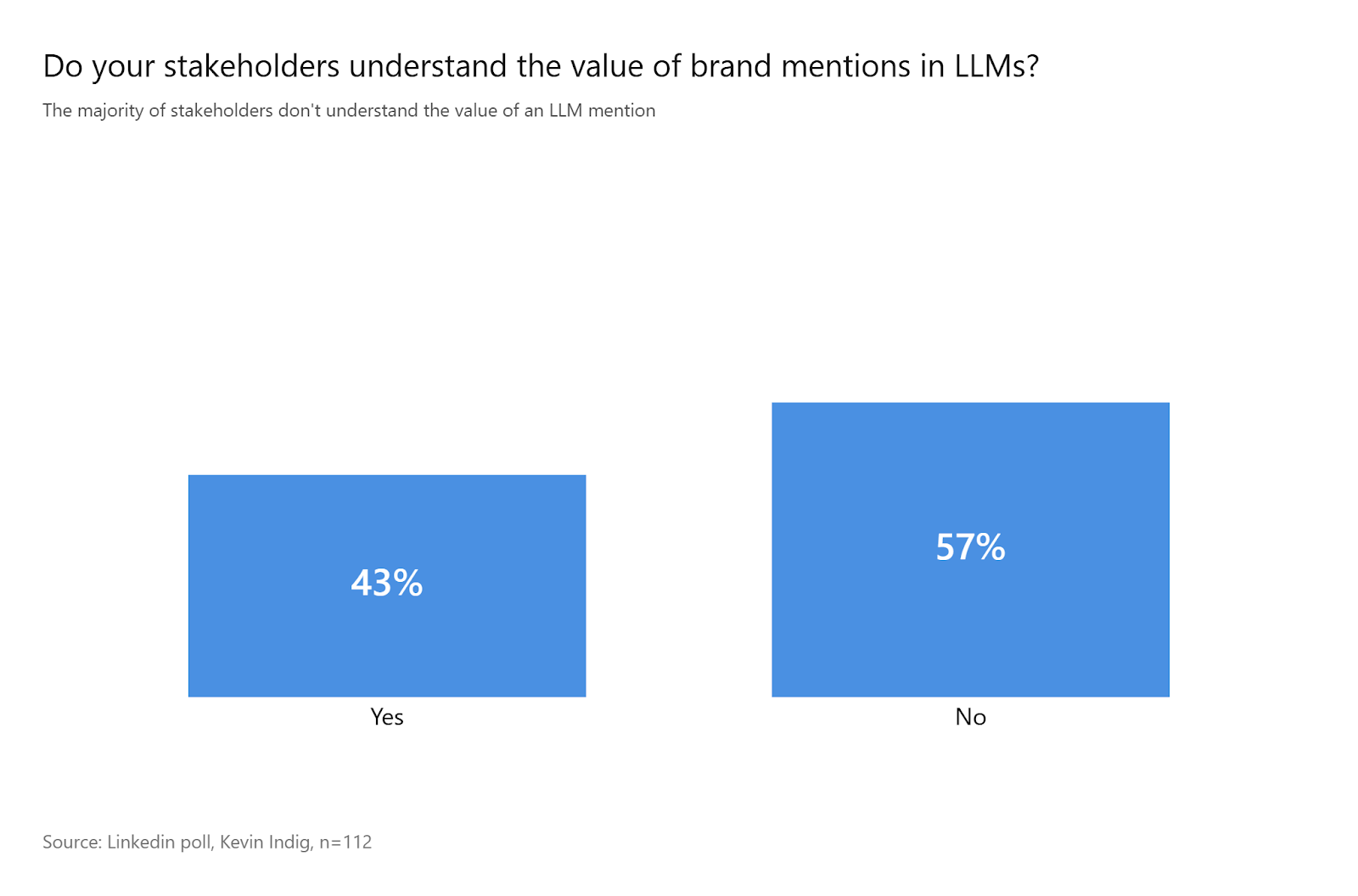 Image Credit: Kevin IndigMeanwhile, close to 60% of those who responded to my recent poll report their stakeholders don’t understand the value of brand mentions in LLMs.