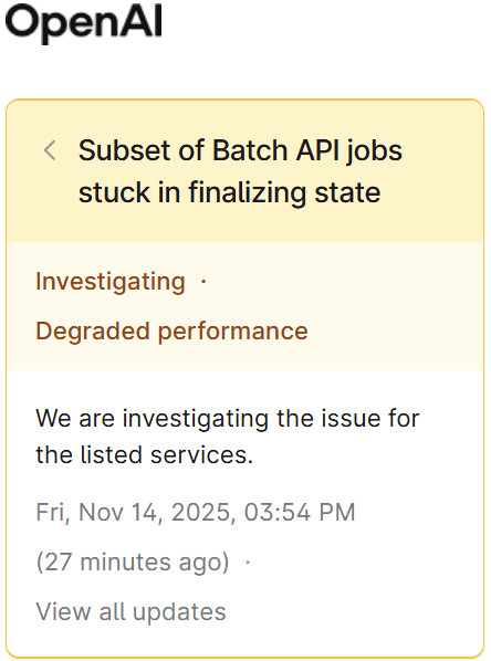 The first issue is that batch API jobs get stuck in the finalization state. There are twelve components of APIs that are monitored for uptime and it’s the Batch part that’s experiencing “degraded” performance. The issue has been ongoing since 3:54 PM.
