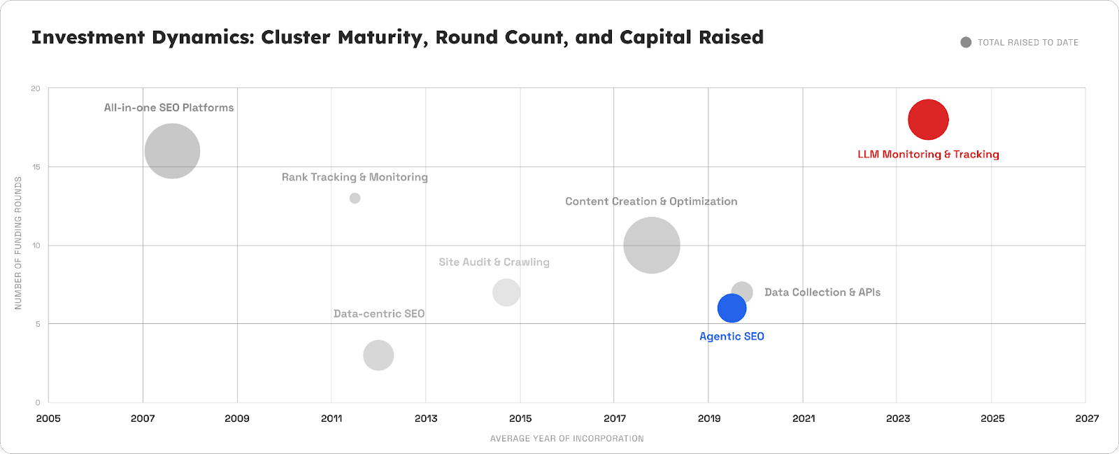 73% of AI visibility tracking companies were founded in 2024 and raised $12 million on average. That check size is typically reserved for scale-stage companies with proven market-fit.